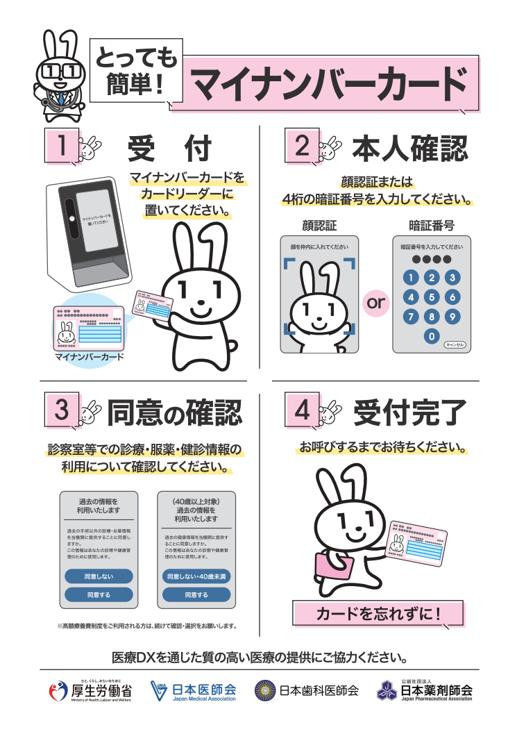①オンライン資格確認等システムによる取得した医療情報等を活用して診療を実施しております。 ②マイナ保険証利用を促進するなど、医療DXを通じて質の高い医療を提供できるよう取り組んでおります。 ③電子処方箋の発行や電子カルテ情報共有サービスなどの医療DXにかかる取組を実施してまいります。(今後導入予定です。) 《こちらもご覧ください》